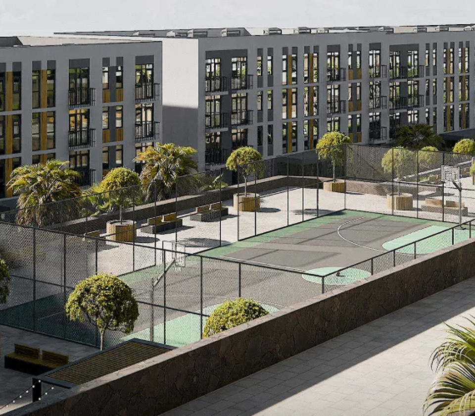 • Детские игровые зоны, места для отдыха и локации для спорта с полноразмерной многофункциональной площадкой
