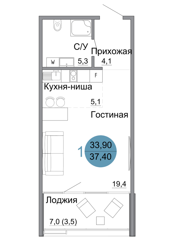 Студия  37.4 м2